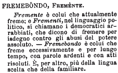| Fremebondo, Fremente - Fremente è colui che attualmente freme; e Frementi, nel linguaggio politico, si chiamano i democratici arrabbiati, che dicono di fremere per isdegno contro gli abusi del potere assoluto. - Fremebondo è colui che freme eccessivamente e per lungo tempo, con parole ardenti e con atti risoluti. E', per altro, più della lingua scelta che della familiare. [immagine] |