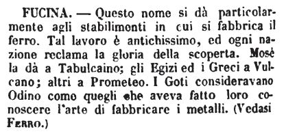 | Fucina - S. f. Luogo dove i fabbri bollono, fondono, colano e affinano il ferro e altri metalli. (Fanf.) Non da Officina; ma o da Focus, come da Coquus, Cucina; o dal fondere i metalli, Fundo, Fusilis: e i Ven. Fusina. I Tosc. possono averlo commutato in C, come in Cucina e Cucire.