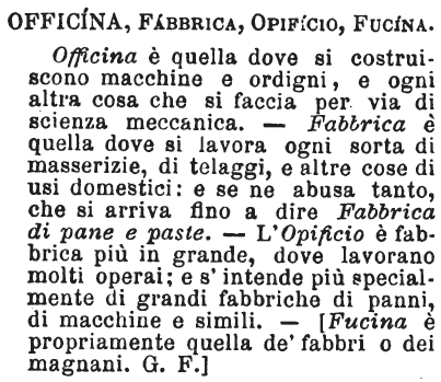 | Officina, Fabbrica, Opificio, Fucina - Officina è quella dove si costruiscono macchine e ordigni, e ogni altra cosa che si faccia per via di scienza meccanica. - Fabbrica è quella dove si lavora ogni sorta di masserizie, di telaggi, e altre cose di usi domestici: e se ne abusa tanto, che si arriva fino a dire Fabbrica di pane e paste. - L'Opificio è fabbrica più in grande, dove lavorano molti operai; e s'intende più specialmente di grandi fabbriche di panni, di macchine e simili. - [Fucina è propriamente quella de' fabbri o dei magnani. G. F.] [immagine] |