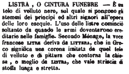 | Listra, o cintura funebre - E' un telo di velluto nero, sul quale si pongono gli stemmi dei principi ed altri signori all'epoca delle loro esequie. L'uso delle listre cominciò soltanto da quando le armi diventarono ereditarie nelle famiglie. Secondo Ménage, la voce francese Litre deriva da Littera, che in Greco significa una corona insitata da quel telo di velluto e da pittura che contorna la chiesa, o meglio da Listra, che vale striscia di stoffa lunga e stretta. [immagine] |