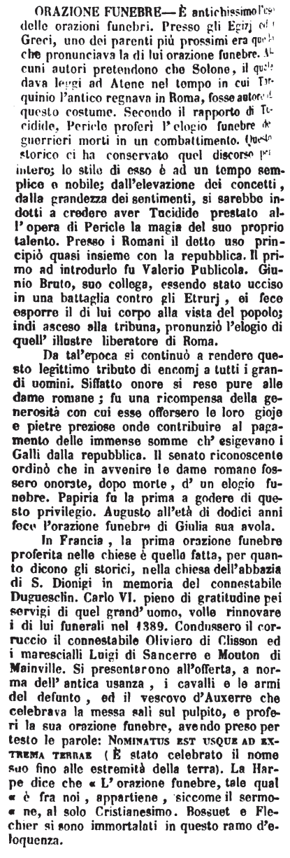 | Orazione funebre - È antichissimo l'uso delle orazioni funebri. Presso gli Egizj ed i Greci, uno dei parenti era quel che pronunciava la di lui orazione funebre. Alcuni autori pretendono che Solone, il quale dava leggi ad Atene nel tempo in cui Tarquinio l'antico regnava in Roma, fosse autore di questo costume. Secondo il rapporto di Tucidide, Pericle proferì l'elogio funebre de guerrieri morti in un combattimento. Questo storico ci ha conservato quel discorso per intero; lo stile di esso è ad un tempo semplice e nobile; dall'elevazione dei concetti, dalla grandezza dei sentimenti, si sarebbe indotti a credere aver Tucidide prestato all'opera di Pericle la magia del suo proprio talento. Presso i Romani il detto uso principiò quasi insieme con la repubblica. Il primo ad introdurlo fu Valerio Publicola. Giunio Bruto, suo collega, essendo stato ucciso in una battaglia contro gli Etrurj, ei fece esporre il di lui corpo alla vista del popolo; indi asceso alla tribuna, pronunziò l'elogio di quell'illustre liberatore di Roma.
