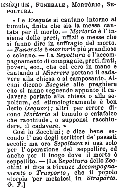 Esequie, Funerale, Mortorio, Sepoltura - «Le Esequie si cantano intorno al tumulo, finita che sia la messa cantata per il morto. - Mortorio è l'insieme delle preci, uffizii e messe che si fanno dire in suffragio del morto. - Funerale è mortorio più grandioso e solenne. - La Sepoltura è l'accompagnamento di compagnie, preti, frati, poveri, ecc., che col cero in mano e cantando il Miserere portano il cadavere alla chiesa o al camposanto. Alcuni dicono Esequie alle preghiere che si fanno seguendo appunto il cadavere portato alla chiesa o alla sepoltura, ed etimologicamente è ben detto (sequor); altri per errore dicono Mortorio al tumulo o catafalco che racchiude, o supponsi racchiudere, il cadavere.»