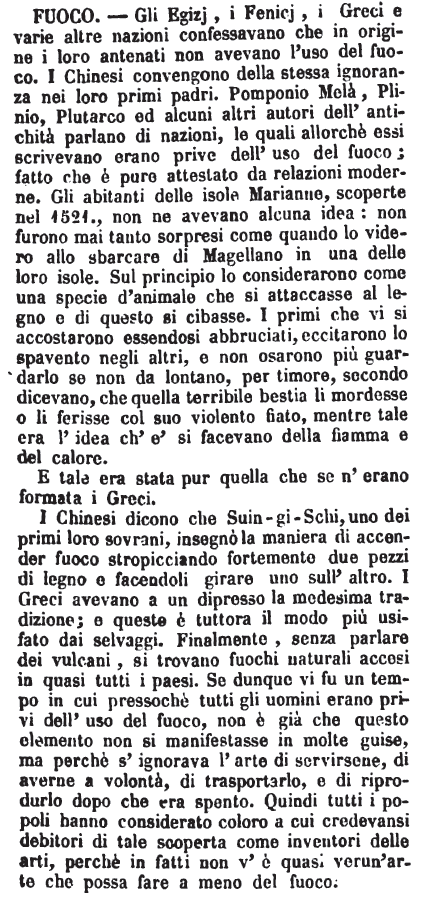 | Fuoco - Gli Egizj, i Fenicj, i Greci e varie altre nazioni confessavano che in origine i loro antenati non avevano l'uso del fuoco. I Chinesi convengono della stessa ignoranza nei loro primi padri. Pomponio Melà, Plinio, Plutarco ed alcuni altri autori dell'antichità parlano di nazioni, le quali allorchè essi scrivevano erano prive dell'uso del fuoco; fatto che è pure attestato da relazioni moderne. Gli abitanti delle isole Marianne, scoperte nel 1521., non ne avevano alcuna idea: non furono mai tanto sorpresi come quando lo videro allo sbarcare di Magellano in una delle loro isole. Sul principio lo considerarono come una specie d'animale che si attaccasse al legno e di questo si cibasse. I primi che vi si accostarono essendosi abbruciati, eccitarono lo spavento negli altri, e non osarono più guardarlo se non da lontano, per timore, secondo dicevano, che quella terribile bestia li mordesse o li ferisse col suo violento fiato, mentre tale era l'idea ch'e' si facevano della fiamma e del calore.
