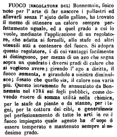 | Fuoco (regolatore del) - Bonnemain, fisico noto per l'arte di far nascere i pollastri ed allevarli senza l'ajuto delle galline, ha trovato il mezzo di ottenere un calore sempre perfettamente uguale, ed a quel grado a cui lo vuole, mediante l'applicazione di un regolatore, che adatta ai fornelli, alle stufe ed altri utensili atti a contenere del fuoco. Si adopra questo regolatore, i di cui vantaggi facilmente si distinguono, per mezzo di un ago che segna sopra un quadrato i diversi gradi di calore che si vogliono avere; girando l'ago a diritta, il fuoco aumenta, e girandolo a sinistra diminuisce; fissato che quello sia, il calore non varia più. Questo istrumento fu annunziato da Bonnemain nel 1784 sui fogli pubblici, come dovendo essere di somma utilità nella chimica, per le stufe da piante e da stanze, per i bagni, per la cottura dei cibi, e generalmente pel perfezionamento di tutte le arti in cui il fuoco impiegato quale agente ha d'uopo di essere temperato e mantenuto sempre al medesimo grado. [immagine] |