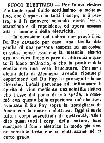 | Fuoco elettrico - Per fuoco elettrico s'intende quel fluido sottilissimo e molto attivo, che è sparso in tutti i corpi, e li penetra, e li fa muovere secondo certe leggi di attrazione e di repulsione, ed opera insomma tutti i fenomeni della elettricità.