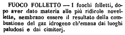 | Fuoco folletto - I fuochi folletti, dopo aver dato materia alle più ridicole novellette, sembrano essere il resultato dalla combustione del gaz idrogeno ch'emana dai luoghi paludosi e dai cimiterj. [immagine] |