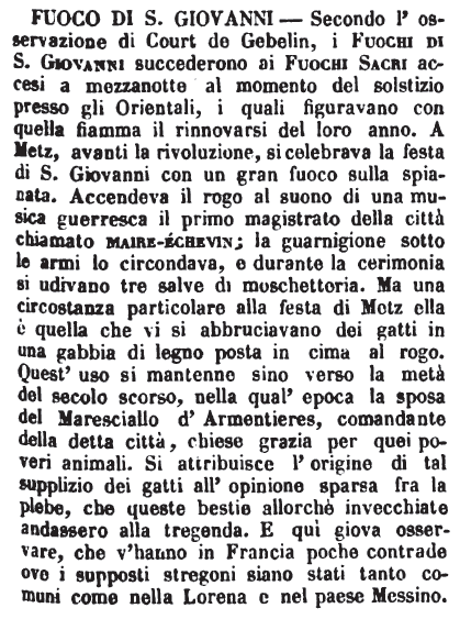 | Fuoco di S. Giovanni - Secondo l'osservazione di Court de Gebelin, i Fuochi di S. Giovanni succederono ai Fuochi Sacri accesi a mezzanotte al momento del solstizio presso gli Orientali, i quali figuravano con quella fiamma il rinnovarsi del loro anno. A Metz, avanti la rivoluzione, si celebrava la festa di S. Giovanni con un gran fuoco sulla spianata. Accendeva il rogo al suono di una musica guerresca il primo magistrato della città chiamato maire-échevin; la guarnigione sotto le armi lo circondava, e durante la cerimonia si udivano tre salve di moschetteria. Ma una circostanza particolare alla festa di Metz ella è quella che vi si abbruciavano dei gatti in una gabbia di legno posta in cima al rogo. Quest'uso si mantenne sino verso la metà del secolo scorso, nella qual'epoca la sposa del Maresciallo d'Armentieres, comandante della detta città, chiese grazia per quei poveri animali. Si attribuisce l'origine di tal supplizio dei gatti all'opinione sparsa fra la plebe, che queste bestie allorchè invecchiate andassero alla tregenda. E qui giova osservare, che v'hanno in Francia poche contrade ove i supposti stregoni siano stati tanto comuni come nella Lorena e nel paese Messino. [immagine] |
