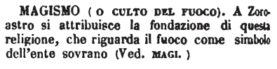 | Magismo (o culto del fuoco) - A Zoroastro si attribuisce la fondazione di questa religione, che riguarda il fuoco come simbolo dell'ente sovrano (Ved. magi.) [immagine] |
