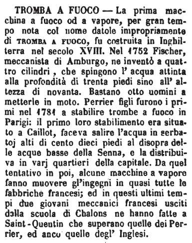| Tromba a fuoco - La prima macchina a fuoco od a vapore, per gran tempo nota col nome datole impropriamente di tromba a fuoco, fu costruita in Inghilterra nel secolo XVIII. Nel 1752 Fischer, meccanista di Amburgo, ne inventò a quattro cilindri, che spingono l'acqua attinta alla profondità di trenta piedi sino all'altezza di novanta. Bastano otto uomini a metterle in moto. Perrier figli furono i primi nel 1781 a stabilire trombe a fuoco in Parigi: il loro primo stabilimento era situato a Caillot, faceva salire l'acqua in serbatoj alti di cento dieci piedi al di sopra delle acque basse della Senna, e la distribuiva in varj quartieri della capitale. Da quel tentativo in poi, alcune macchine a vapore fanno muovere gl'ingegni in quasi tutte le fabbriche francesi; ed in questi ultimi tempi due giovani meccanici francesi uscita dalla scuola di Chalons ne hanno fatte a Saint-Quentin che superano quelle di Perrier, ed anco quelle degl'Inglesi. [immagine] |