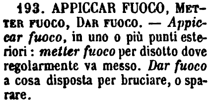 | Appiccar fuoco, Metter fuoco, Dar fuoco - Appiccar fuoco, in uno o più punti esteriori: metter fuoco per disotto dove regolarmente va messo. Dar fuoco a cosa disposta per bruciare, o sparare. [immagine] |