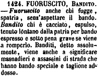 | Fuoruscito, Bandito - Fuoruscito anche chi fugge, spatria, senz'aspettare il bando. Bandito chi è cacciato, espulso, tenuto lontano dalla patria per bando espresso e sotto pena grave se viene a romperlo. Banditi, detto assolutamente, viene anche a significare masnadieri e assassini di strada che hanno bando speciale e taglione addosso. [immagine] |