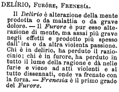 | Delirio, Furore, Frenesia - Il Delirio è alterazione della mente prodotta o da malattia o da grave dolore. - Il Furore è pur esso alterazione di mente, ma assai più grave negli effetti e prodotto più spesso dall'ira o da altra violenta passione. Chi è in delirio, ha perduto il raziocinio; chi è in furore, ha perduto in tutto il lume della ragione e dà nelle furie e viene ad atti violenti e al tutto dissennati, onde va frenato con la forza. - Frenesia è il primo grado del Furore. [immagine] |