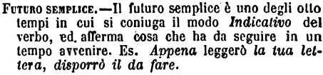 | Futuro anteriore - Anche il futuro anteriore appartiene all'indicativo, e si considera come passato relativamente ad altro tempo; epperò afferma cosa che deve accadere, prima d'un'altro che ha da venire, come: Allorchè sarai stato avvertito, partirai per la Capitale. [immagine] |