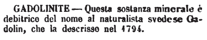 | Gadolinite - Questa sostanza minerale è debitrice del nome al naturalista svedese Gadolin, che la descrisse nel 1794. [immagine] |
