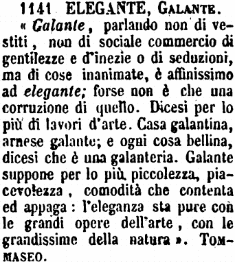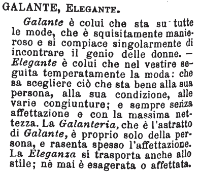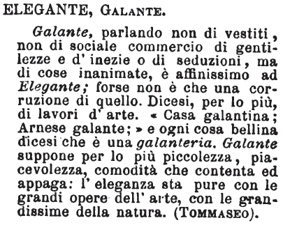 | Elegante, Galante - «Galante, parlando non di vestiti, non di sociale commercio di gentilezze e d'inezie o di seduzioni, ma di cose inanimate, è affinissimo ad elegante; forse non è che una corruzione di quello. Dicesi per lo più di lavori d'arte. Casa galantina, arnese galante; e ogni cosa bellina, dicesi che è una galanteria. Galante suppone per lo più piccolezza, piacevolezza, comodità che contenta ed appaga: l'eleganza sta pure con le grandi opere dell'arte, con le grandissime della natura». Tommaseo. [immagine] |
