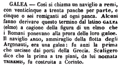 | Galea - Così si chiama un naviglio a remi, con venticinque a trenta panche per parte, e cinque o sei remiganti ad ogni panca. Alcuni fanno derivare questo termine dal latino galea (elmo) a cagione della figura di un elmo che i Romani ponevano alla prora delle loro galee. Il naviglio argo, ammiraglio della flotta degli Argonauti, era una galea: fu anzi la prima che uscisse dai porti della Grecia. Scaligero dice che la prima a tre piani, da lui nomata triremis, fu costruita a Corinto. [immagine] |