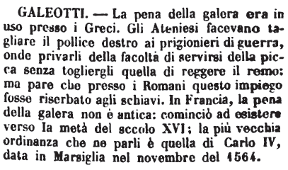 | Galeotti - La pena della galera era in uso presso i Greci. Gli Ateniesi facevano tagliare il pollice destro ai prigionieri di guerra, onde privarli della facoltà di servirsi della picca senza togliergli quella di reggere il remo: ma pare che presso i Romani questo impiego fosse riserbato agli schiavi. In Francia, la pena della galera non è antica: cominciò ad esistere verso la metà del secolo XVI; la più vecchia ordinanza che ne parli è quella di Carlo IV, data in Marsiglia nel novembre del 1564. [immagine] |