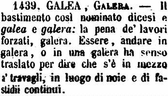 | Galea, Galera - Il bastimento così nominato dicesi e galea e galera: la pena de' lavori forzati, galera. Essere, andare in galera, o in una galera ha senso traslato per dire che s'è in mezzo a' travagli, in luogo di noie e di fastidii continui. [immagine] |