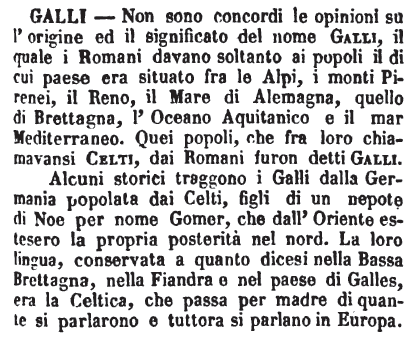 Galli - Non sono concordi le opinioni su l'origine ed il significato del nome Galli, il quale i Romani davano soltanto ai popoli il di cui paese era situato fra le Alpi, i monti Pirenei, il Reno, il Mare di Alemagna, quello di Brettagna, l'Oceano Aquitanico e il mar Mediterraneo. Quei popoli, che fra loro chiamavansi Celti, dai Romani furon detti Galli.