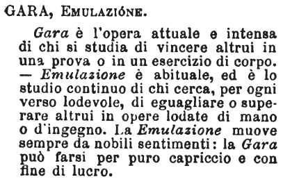 | Gara, Emulazione - Gara è l'opera attuale e intensa di chi si studia di vincere altrui in una prova o in un esercizio di corpo. - Emulazione è abituale, ed è lo studio continuo di chi cerca, per ogni verso lodevole, di eguagliare o superare altrui in opere lodate di mano o d'ingegno. La Emulazione muove sempre da nobili sentimenti: la Gara può farsi per puro capriccio e con fine di lucro. [immagine] |