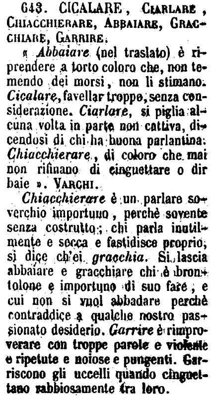 | Cicalare, Ciarlare, Chiacchierare, Abbaiare, Gracchiare, Garrire - « Abbaiare (nel traslato) è riprendere a torto coloro che, non temendo dei morsi, non li stimano. Cicalare, favellar troppo, senza considerazione. Ciarlare, si piglia alcuna volta in parte non cattiva, dicendosi di chi ha buona parlantina. Chiacchierare, di coloro che mai non rifinano di cinguettare o dir baie ». Varchi.
