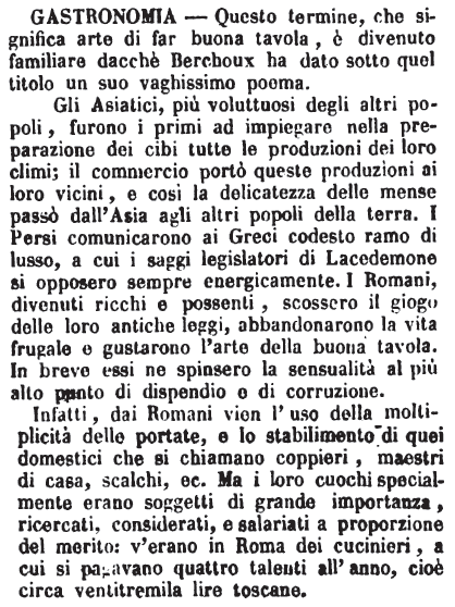 | Gastronomia - Questo termine, che significa arte di far buona tavola, è divenuto familiare dacchè Berchoux ha dato sotto quel titolo un suo vaghissimo poema.