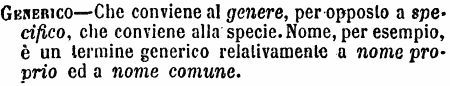 | Generico - Che conviene al genere, per opposto a specifico, che conviene alla specie. Nome, per esempio, è un termine generico relativamente a nome proprio ed a nome comune. [immagine] |