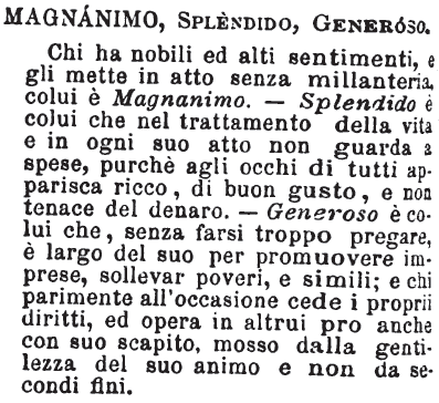 | Magnanimo, Splendido, Generoso - Chi ha nobili ed alti sentimenti, e gli mette in atto senza millanteria, colui è Magnanimo. - Splendido è colui che nel trattamento della vita e in ogni suo atto non guarda a spese, purchè agli occhi di tutti apparisca ricco, di buon gusto, e non tenace del denaro. - Generoso è colui che, senza farsi troppo pregare, è largo del suo per promuovere imprese, sollevar poveri, e simili; e chi parimente all'occasione cede i proprii diritti, ed opera in altrui pro anche con suo scapito, mosso dalla gentilezza del suo animo e non da secondi fini. [immagine] |