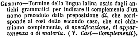 | Genitivo - [T.] Agg. e Sost. T. gramm. Il secondo caso della declinazione de' nomi nelle lingue latina e greca, quindi in altre per anal. o per abus. detto anco in gr. ἡ γενικὴ (πτῶσις) perchè la generazione costituisce una naturale dipendenza del generato dal generante, o almeno un'appartenenza di quello a questo; onde il genitivo passa a denotare in gen. discendenza, proprietà, appartenenza. T. Svet. Caso genitivo. Men propriam. altri lo chiamò Patrio o Interrogante; come il quarto Accusativo, che men male potevasi Laudativo. = Salvin. Pros. Tosc. 2. 117. (C) Questo caso, che i Greci chiamano possessivo, i Latini dicono Genitivo. Salv. Avvert. 2. 1. 15. Così dal generare, quella caduta o cadenza nominan genitivo, che par propria del possedere, e hannola per la seconda. T. Buomm. Ling. Tosc. 137. L'uso de' segnacasi… è tale che Di serve al genitivo, A al dativo e Da all'ablativo. – Ma Di talvolta e A stanno per Da; e Da talvolta ha un valore di dipendenza che lo approssima all'idea solita significarsi dal genitivo. Lo dicevano Caso (πτῶσις), perchè denotato dalla desin., onde è chiaro che l'it. non ha propriamente genitivo; e che la voce non sarebbe da usare se non in relaz. alle lingue che portano tal desinenza. Ma per più speditezza adoprasi da coloro che intendono già