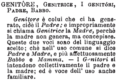 | Genitore, Genitrice, I genitori, Padre, Babbo - Genitore è colui che ci ha generato, cioè il Padre; e impropriamente si chiama Genitrice la Madre, perchè la madre non genera, ma concepisce. Queste due voci sono del linguaggio scelto; chè nell'uso comune si dice Padre e Madre, e più affettuosamente Babbo e Mamma. - I Genitori si intendono collettivamente il padre e la madre; ed è voce dell'uso anche familiare. [immagine] |