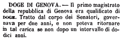 | Doge di Genova - Il primo magistrato della repubblica di Genova era qualificato di Doge. Tratto dal corpo dei Senatori, governava per due anni, e non poteva ritornare in tal carica se non dopo un intervallo di dodici anni. [immagine] |