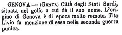 | Genova - (Genua) Città degli Stati Sardi, situata nel golfo a cui dà il suo nome. L'origine di Genova è di epoca molto remota. Tito Livio fa menzione di essa nella seconda guerra punica. [immagine] |