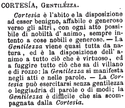 | Cortesia, Gentilezza - Cortesia è l'abito e la disposizione ad esser benigno, affabile e generoso verso gli altri, con ogni atto possibile di nobiltà d'animo, sempre intento a cose nobili e generose. - La Gentilezza viene quasi tutta da natura, ed è la disposizione dell'animo a tutto ciò che è virtuoso, ed a fuggire tutto ciò che sa di villano e di rozzo: la Gentilezza si manifesta negli atti e nelle parole. - La Cortesia può esercitarsi senza gentilezza o leggiadria di parole o di modi; la Gentilezza è difficile che sia scompagnata dalla Cortesia. [immagine] |