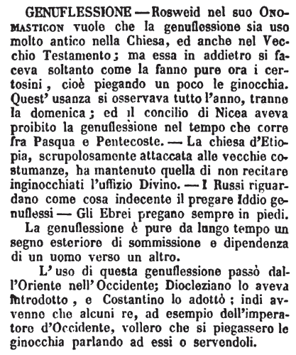 | Genuflessione - Rosweid nel suo Onomasticon vuole che la genuflessione sia uso molto antico nella Chiesa, ed anche nel Vecchio Testamento; ma essa in addietro si faceva soltanto come la fanno pure ora i certosini, cioè piegando un poco le ginocchia. Quest'usanza si osservava tutto l'anno, tranne la domenica; ed il concilio di Nicea aveva proibito la genuflessione nel tempo che corre fra Pasqua e Pentecoste. - La chiesa d'Etiopia, scupolosamente attaccata alle vecchie costumanze, ha mantenuto quella di non recitare inginocchiati l'uffizio Divino. - I Russi riguardano come cosa indecente il pregare Iddio genuflessi - Gli Ebrei pregano sempre in piedi.
