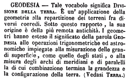| Geodesia - S. f. Dal gr. Γέα Terra, e da Δήσω, fut. di Δέω, Io divido. (Mat.) [Gen.] Quella parte della geometria pratica, la quale insegna l'arte di misurare, dividere e descrivere le terre di diversi proprietarii; più com. Agrimensura. Ma oggidì s'applica più propriamente alla scienza che insegna le operazioni geometriche o trigonometriche necessarie a levar la carta più esatta de' paesi, o a trovare la lunghezza di un grado del meridiano terrestre o in generale d'una porzione qualunque del meridiano o d'un circolo massimo o minore della terra. |