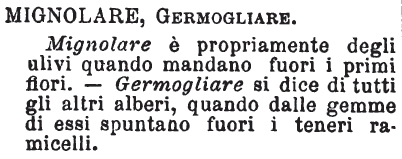 | Mignolare, Germogliare - Mignolare è propriamente degli ulivi quando mandano fuori i primi fiori. - Germogliare si dice di tutti gli altri alberi, quando dalle gemme di essi spuntano fuori i teneri ramicelli. [immagine] |