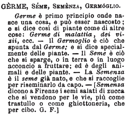 | Germe, Seme, Semenza, Germoglio - Germe è primo principio onde nasce una cosa, e può esser nascosto; e si dice così di piante come di altre cose: Germe di malattia, dei vizii, ecc. - Il Germoglio è ciò che spunta dal Germe; e si dice specialmente delle piante. - Il Seme è ciò che si sparge, o in terra o in luogo acconcio a fruttare; ed è degli animali e delle piante. - La Semenza è il seme già nato, e che si raccoglie per riseminarlo da capo. - [Semenza dicono a Firenze i semi salati di zucca che si vendono per le vie, più come trastullo o come ghiottoneria, che per cibo. G.F.] [immagine] |