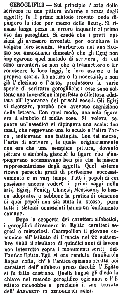 | Geroglifici - Sul principio l'arte dello scrivere fu una pittura informe e rozza degli oggetti; fu il primo metodo trovato onde dipingere le idee per mezzo delle figure. Si rimase lunga pezza in errore inquanto al primo uso dei geroglifici. Si credè che i preti egiziani gli avessero inventati per occultare la volgare loro scienza. Warburton nel suo Saggio sui geroglifici dimostrò che gli Egizj non impiegarono quel metodo di scrivere, di cui sono inventori, se non che a trasmettere e far conoscere le loro leggi, le loro usanze e la propria storia. La natura e la necessità, e non già l'elezione e l'arte, produssero le varie specie di scritture geroglifiche: esse sono soltanto una invenzione imperfetta e difettosa adattata all'ignoranza dei prischi secoli. Gli Egizj vi ricorsero, perchè non avevano cognizione delle lettere. Con quel modo, una sola figura era il simbolo di molte cose. Si voleva segnare un'assedio? si dipingeva una scala: due mani, che reggevano una lo scudo e l'altra l'arco, indicavano una battaglia. Con tal mezzo, l'arte di scrivere, la quale originariamente non era che una semplice pittura, doventò pittura e simbolo, giacchè le figure che s'impiegavano accennavano ben più che la misera rappresentazione degli oggetti. Quel sistema ricevè parecchi gradi di perfezione successivamente e in varj tempi. Tutti i popoli di cui possiamo ancora vedere i primi saggi nelle arti, Egizj, Fenicj, Chinesi, Messicani, lo hanno adoprato, e sebbene la pratica di ciascuno di quei popoli non sia stata la stessa, pure tutti i sistemi conosciuti hanno un fondamento comune.