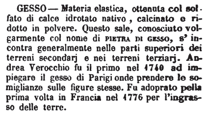 | Gesso - Materia elastica, ottenuta col solfato di calce idrotato nativo, calcinato e ridotto in polvere. Questo sale, conosciuto volgarmente col nome di pietra di gesso, s'ncontra generalmente nelle parti superiori dei terreni secondarj e nei terreni terziarj. Andrea Verrocchio fu il primo nel 1740 ad impiegare il gesso di Parigi onde prendere le somiglianze sulle figure stesse. Fu adoprato pella prima volta in Francia nel 1776 per l'ngrasso delle terre. [immagine] |