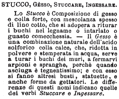 | Stucco, Gesso, Stuccare, Ingessare - Lo Stucco è Composizione di gesso e colla forte, con mescolanza spesso di lino cotto, che si adopera a riturar i buchi nel legname o intarlato o guasto comecchessia. - Il Gesso è una combinazione naturale dell'acido solforico colla calce, che, ridotta in polvere e stemperata in acqua, serve a turar i buchi dei muri, a fermarvi arpioni e spranghe, perchè quando asciuga è tegnentissimo; e con esso si fanno altresì busti, statuette, e anche forme da gettatori. Le differenze di questi nomi indicano quelle dei verbi Stuccare e Ingessare. [immagine] |