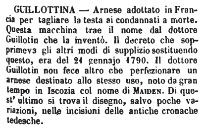 | Guillottina - Arnese adottato in Francia per tagliare la testa ai condannati a morte. Questa macchina trae il nome dal dottore Guillotin che la inventò. Il decreto che sopprimeva gli altri modi di supplizio sostituendo questo, era del 21 gennaio 1790. Il dottore Guillotin non fece altro che perfezionare un arnese destinato allo stesso uso, noto da gran tempo in Iscozia col nome di Maiden. Di quest'ultimo si trova il disegno, salvo poche variazioni, nelle incisioni delle antiche cronache tedesche. [immagine] |