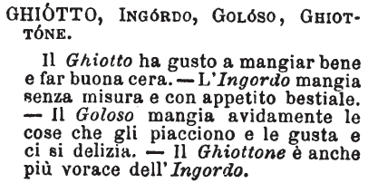 | Ghiotto, Ingordo, Goloso, Ghiottone - Il Ghiotto ha gusto a mangiar bene e far buona cera. - L'Ingordo mangia senza misura e con appetito bestiale. - Il Goloso mangia avidamente le cose che gli piacciono e le gusta e ci si delizia. - Il Ghiottone è anche più vorace dell'Ingordo. [immagine] |