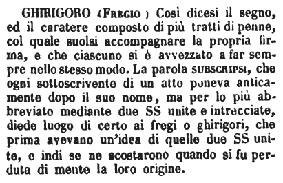 | Ghirigoro (Fregio) - Così dicesi il segno, ed il caratere composto di più tratti di penne, col quale suolsi accompagnare la propria firma, e che ciascuno si è avvezzato a far sempre nello stesso modo. La parola subscripsi, che ogni sottoscrivente di un atto poneva anticamente dopo il suo nome, ma per lo più abbreviato mediante due SS unite e intrecciate, diede luogo di certo ai fregi o ghirigori, che prima avevano un'idea di quelle due SS unite, e indi se ne scostarono quando si fu perduta di mente la loro origine. [immagine] |