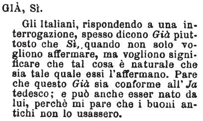 | Già, Sì - Gli Italiani, rispondendo a una interrogazione, spesso dicono Già piuttosto che Sì, quando non solo vogliono affermare, ma vogliono significare che tal cosa è naturale che sia tale quale essi l'affermano. Pare che questo Già sia conforme all'Ja tedesco; e può anche esser nato da lui, perchè mi pare che i buoni antichi non lo usassero. [immagine] |