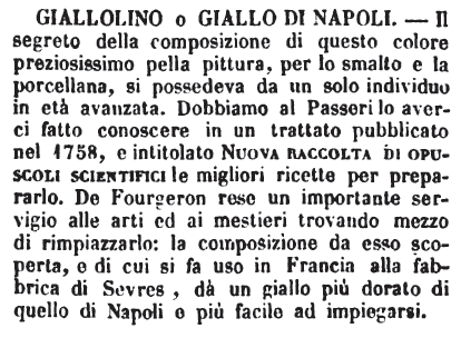 | Giallolino o Giallo di Napoli - Il segreto della composizione di questo colore preziosissimo pella pittura, per lo smalto e la porcellana, si possedeva da un solo individuo in età avanzata. Dobbiamo al Passeri lo averci fatto conoscere in un trattato pubblicato nel 1758, e intitolato Nuova raccolta di opuscoli scientifici le migliori ricette per prepararlo. De Fourgeron rese un importante servigio alle arti ed ai mestieri trovando mezzo di rimpiazzarlo: la composizione da esso scoperta, e di cui si fa uso in Francia alla fabbrica di Sevres, dà un giallo più dorato di quello di Napoli e più facile ad impiegarsi. [immagine] |
