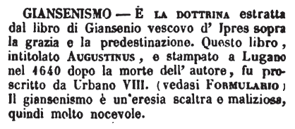 | Giansenismo - E' la dottrina estratta dal libro di Giansenio vescovo d'Ipres sopra la grazia e la predestinazione. Questo libro, intitolato Augustinus e stampato a Lugano nel 1640 dopo la morte dell'autore, fu proscritto da Urbano VIII. (vedasi Formulario) Il giansenismo è un'eresia scaltra e maliziosa, quindi molto nocevole. [immagine] |