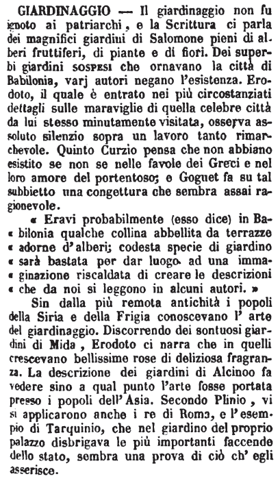 | Giardinaggio - Il giardinaggio non fu ignoto ai patriarchi, e la Scrittura ci parla dei magnifici giardini di Salomone pieni di alberi fruttiferi, di piante e di fiori. Dei superbi giardini sospesi che ornavano la città di Babilonia, varj autori negano l'esistenza. Erodoto, il quale è entrato nei più circostanziati dettagli sulle maraviglie di quella celebre città da lui stesso minutamente visitata, osserva assoluto silenzio sopra un lavoro tanto rimarchevole. Quinto Curzio pensa che non abbiano esistito se non se nelle favole dei Greci e nel loro amore del portentoso; e Goguet fa su tal subbietto una congettura che sembra assai ragionevole.