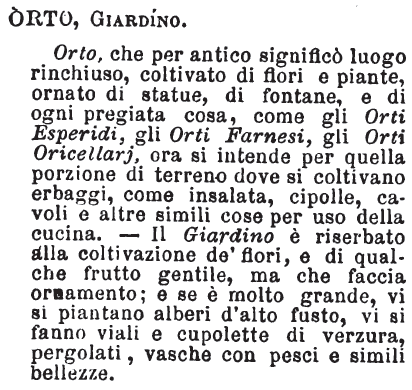 | Orto, Giardino - Orto, che per antico significò luogo rinchiuso, coltivato di fiori e piante, ornato di statue, di fontane, e di ogni pregiata cosa, come gli Orti Esperidi, gli Orti Farnesi, gli Orti Oricellarj, ora si intende per quella porzione di terreno dove si coltivano erbaggi, come insalata, cipolle, cavoli e altre simili cose per uso della cucina. - Il Giardino è riserbato alla coltivazione de' fiori, e di qualche frutto gentile, ma che faccia ornamento; e se è molto grande, vi si piantano alberi d'alto fusto, vi si fanno viali e cupolette di verzura, pergolati, vasche con pesci e simili bellezze. [immagine] |