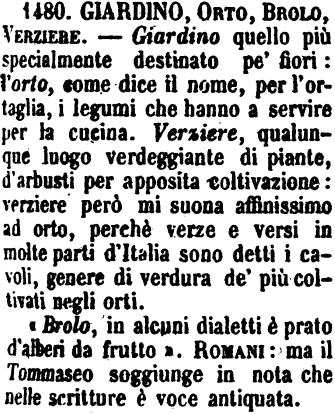 | Giardino, Orto, Brolo, Verziere - Giardino quello più specialmente destinato pe' fiori: l'orto, come dice il nome, per l'ortaglia, i legumi che hanno a servire per la cucina. Verziere, qualunque luogo verdeggiante di piante, d'arbusti per apposita coltivazione: verziere però mi suona affinissimo ad orto, perchè verze e versi in molte parti d'Italia sono detti i cavoli, genere di verdura de' più coltivati negli orti.