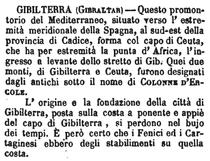 L'origine e la fondazione della città di Gibilterra, posta sulla costa a ponente e appiè del capo di Gibilterra, si perdono nel bujo dei tempi. E' però certo che i Fenici ed i Cartaginesi ebbero degli stabilimenti su quella costa. [immagine] |